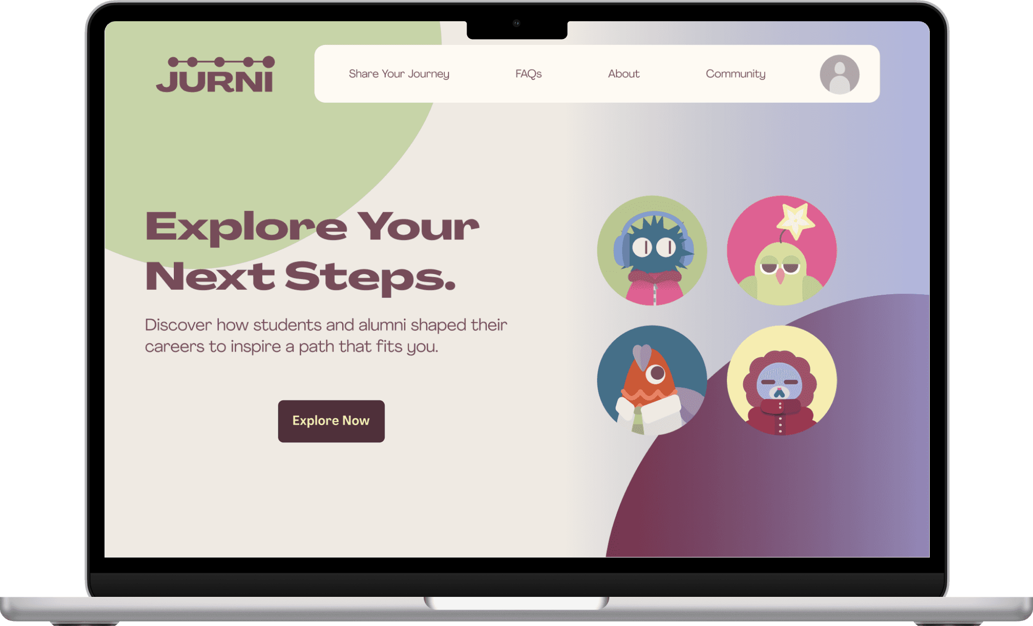 Utilizing my prior UI experience, I created a rough design system for JUURNI. I wanted to emphasize a muted, colourful pallet and characters that users could find relatable. I used Figma to create the four main avatars as well as the JUURNI logo.