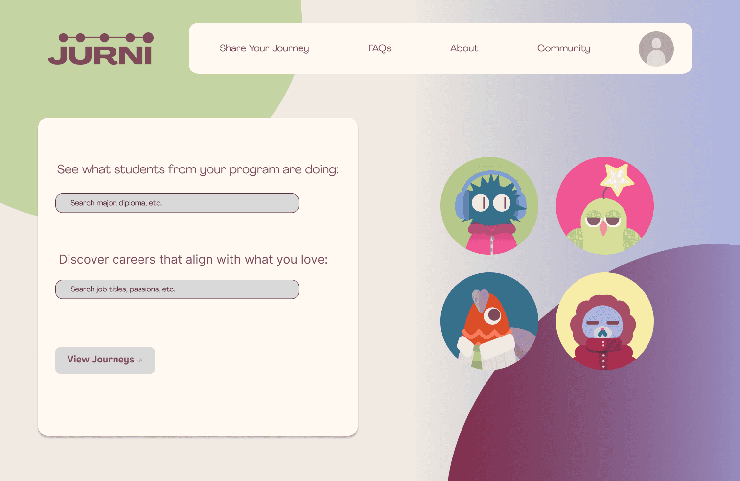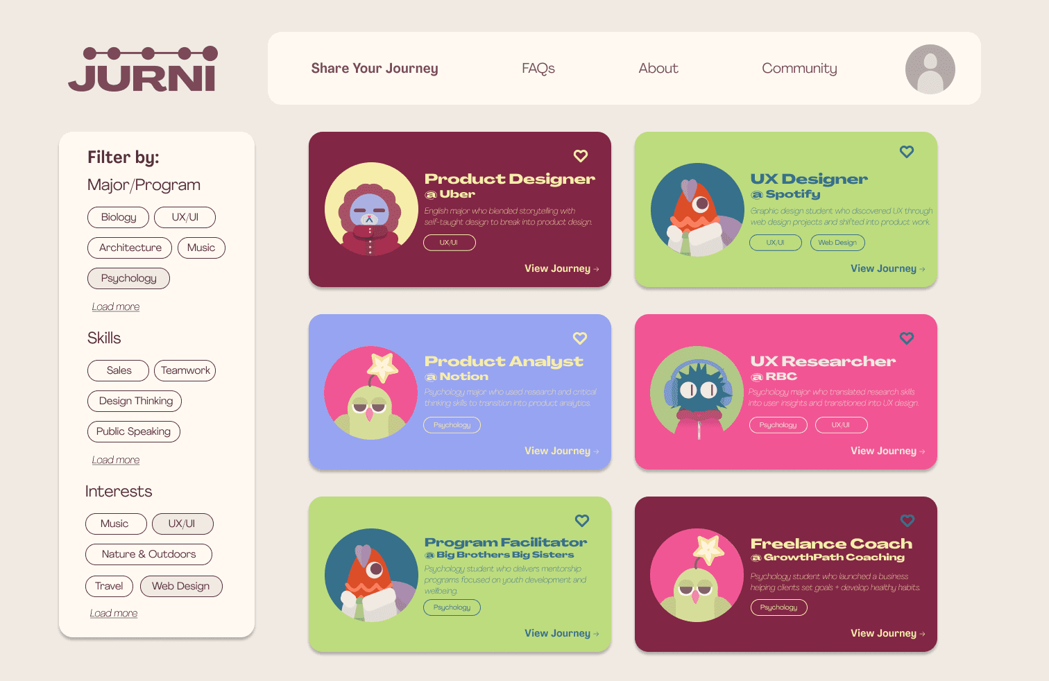 JURNI is a digital platform designed to help students discover and share diverse career pathways by connecting their academic background, interests, and non-traditional experiences.